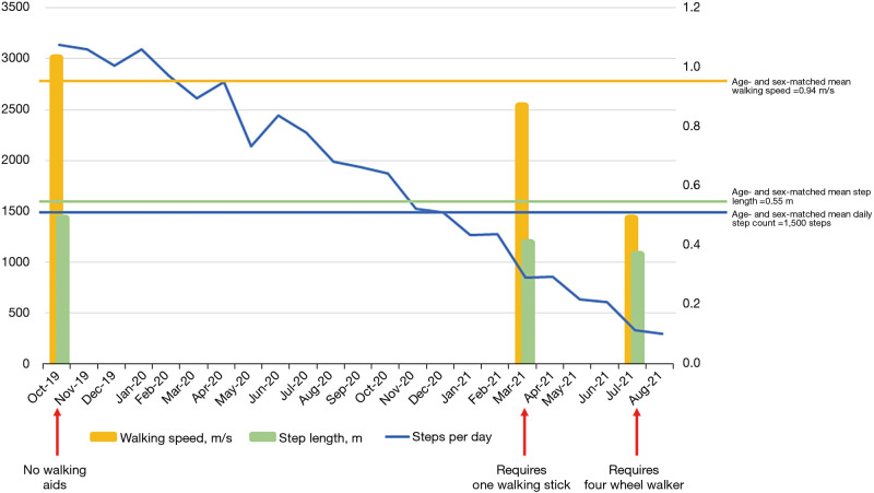 We present the case of an 85-year-old woman with lumbar spinal stenosis (LSS) over 2 years. Walking metrics including daily step count, speed, and length were monitored, showing deterioration (initial: speed =1.03 m/s, length =0.49 m, daily count =3,136; final: speed =0.49 m/s, length =0.37 m, daily count =334). Bilateral lower limb weakness and paraesthesia developed, limiting mobility to a few meters. Surgical management was recommended after shared decision-making. The worsening walking metrics corresponded to increasing need for assistance, from none initially to requiring a four-wheel walker before surgery. This suggests walking deterioration could guide decisions on assistance. This is the first report objectively documenting LSS deterioration using walking metrics over a prolonged period.